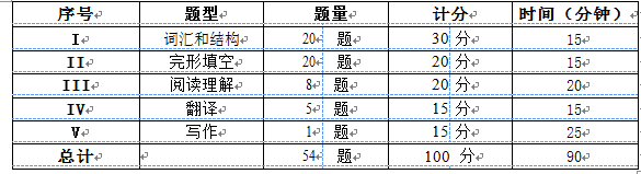 試卷題型分為五個(gè)部分:詞匯和結(jié)構(gòu)、完形填空、閱讀理解、翻譯(漢譯英)和寫作。考試時(shí)間總計(jì) 90 分鐘,滿分為 100 分,達(dá)到 60 分為合格。試卷內(nèi)容結(jié)構(gòu)如下: