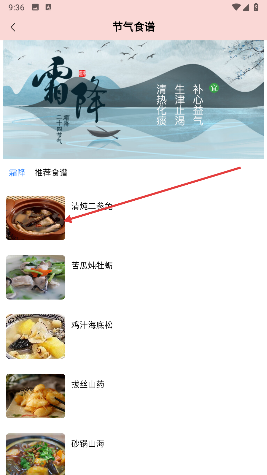 2、在節(jié)氣食譜頁面選擇感興趣的食譜,進入食譜詳情入口。